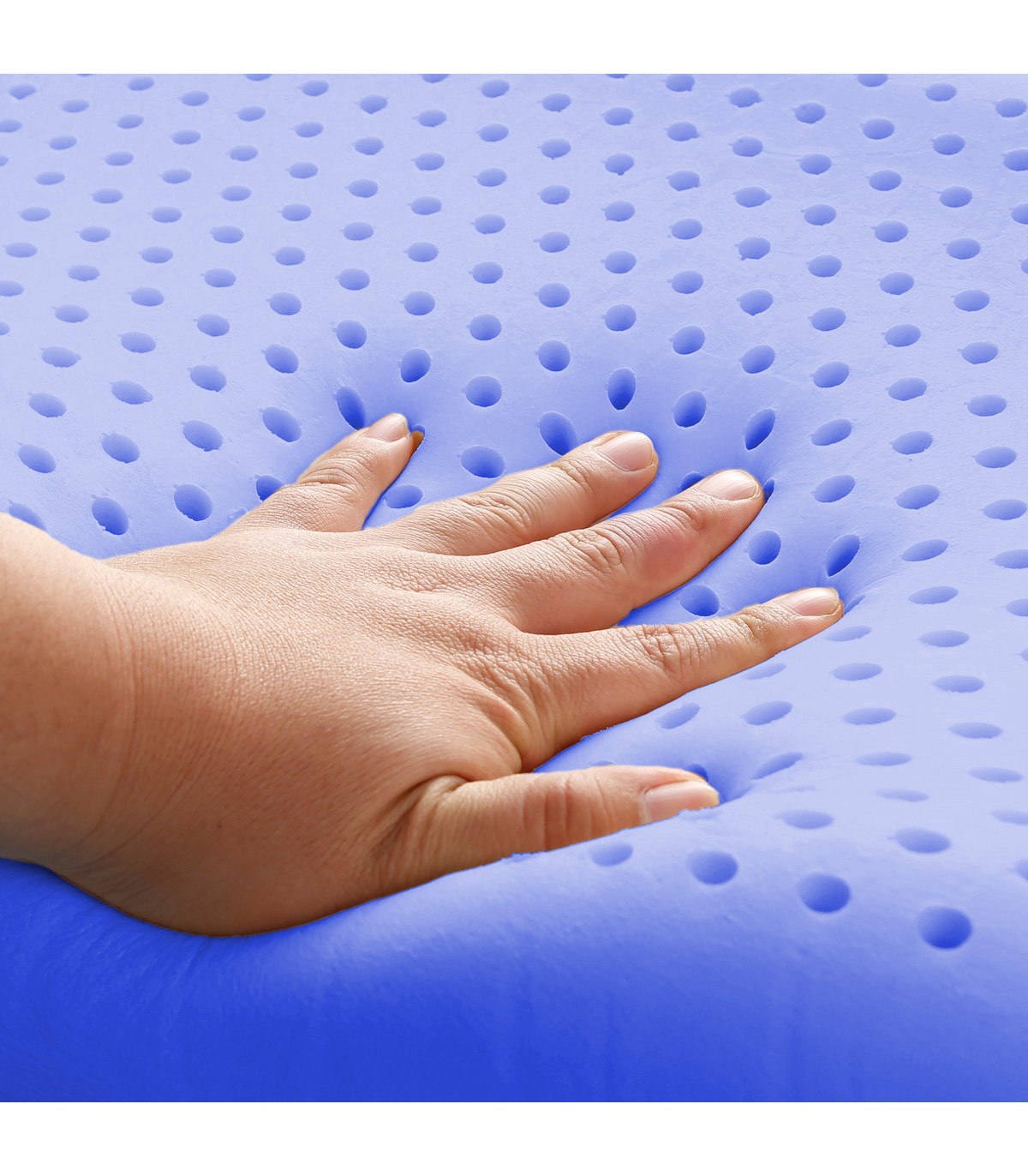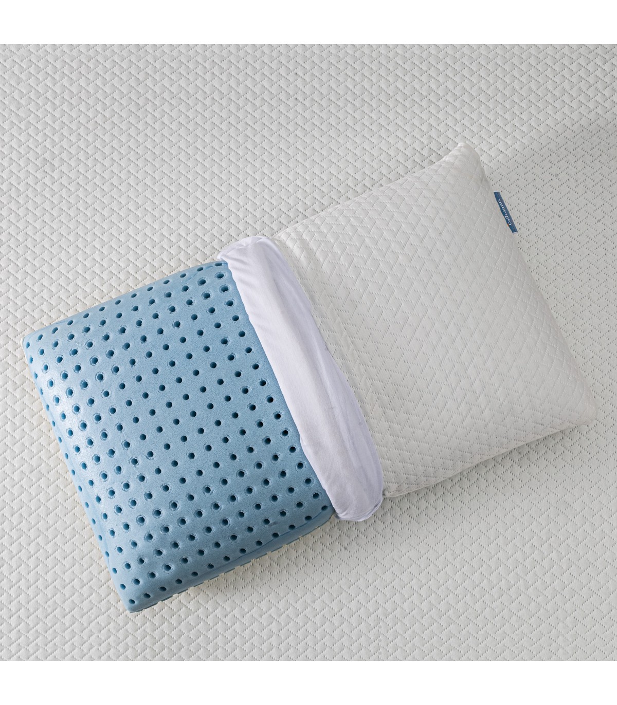 La particolare forma del cuscino dispone di un inserto in Polargel, un particolare materiale di colore azzurro, che rinfresca la pelle mantenendo costante la temperatura corporea. Come ogni cuscino in memory, accoglie i muscoli cervicali alleviandone la tensione.