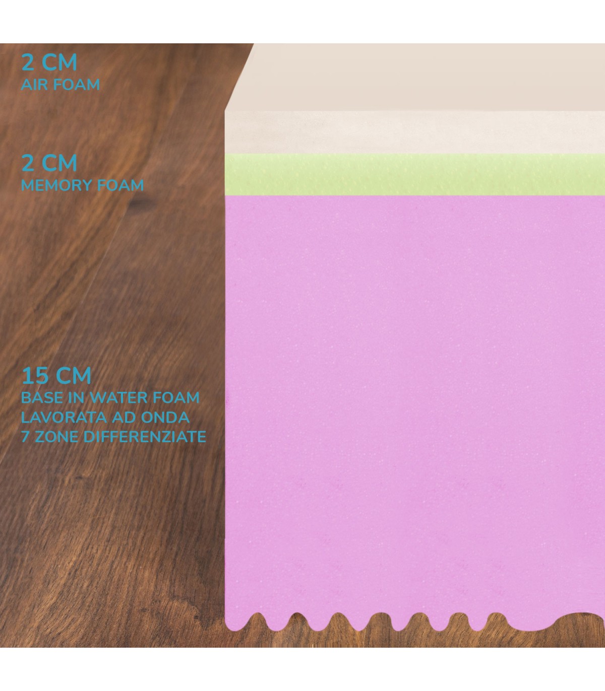 Questo materasso è composto quindi da 2 cm di memory foam + 2 cm di AirPur® che permette la massima traspirabilità al corpo.